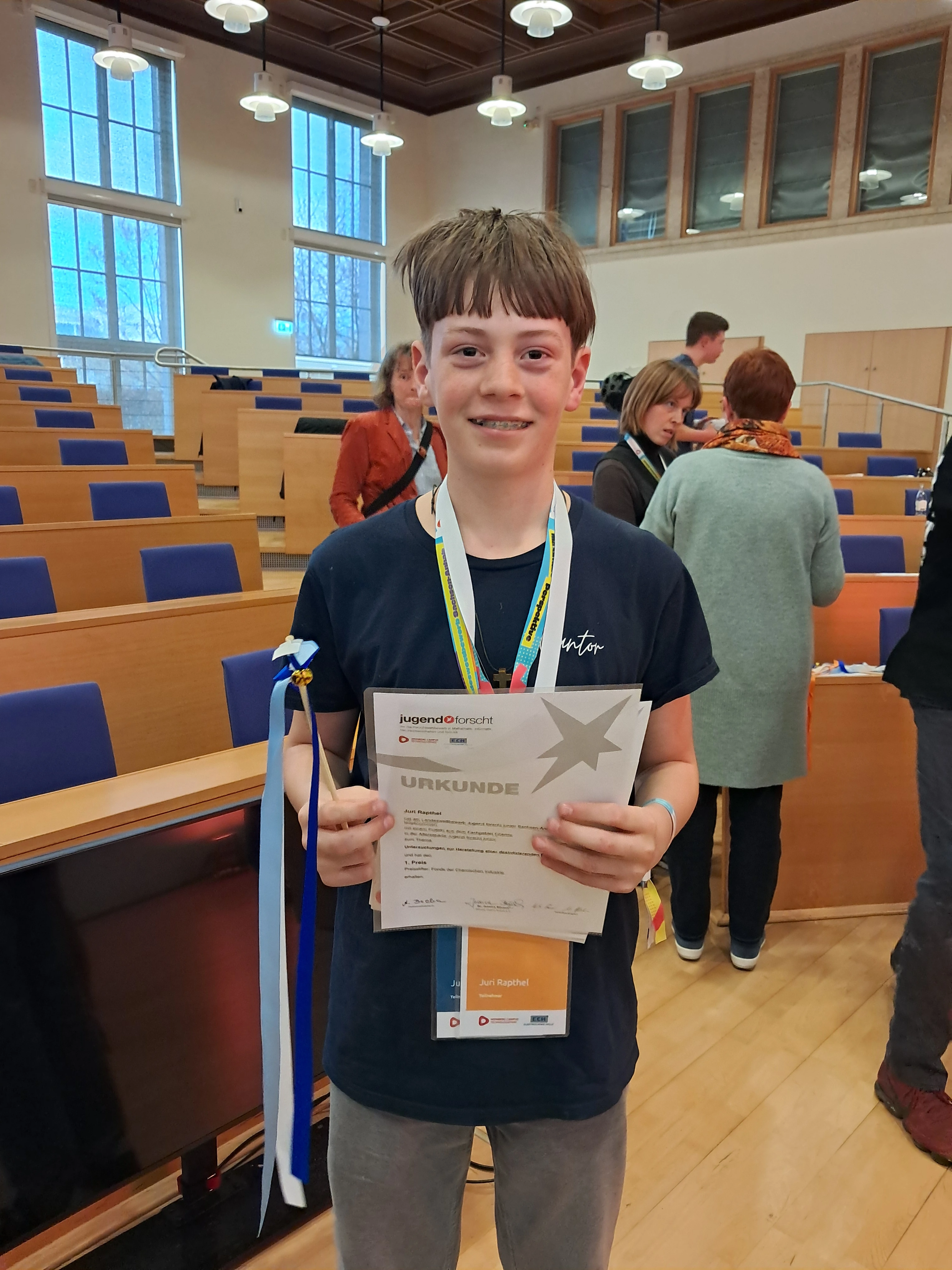 Juri Rapthel aus der Klasse 6/1 trat gleich mit zwei Arbeiten beim Landeswettbewerb „Jugend forscht junior“ an und konnte einen 1. Preis im Fachbereich Chemie und einen 3. Preis im Bereich Technik erringen. Er forschte zu Hautcreme und konstruierte eine besondere Seifenkiste.