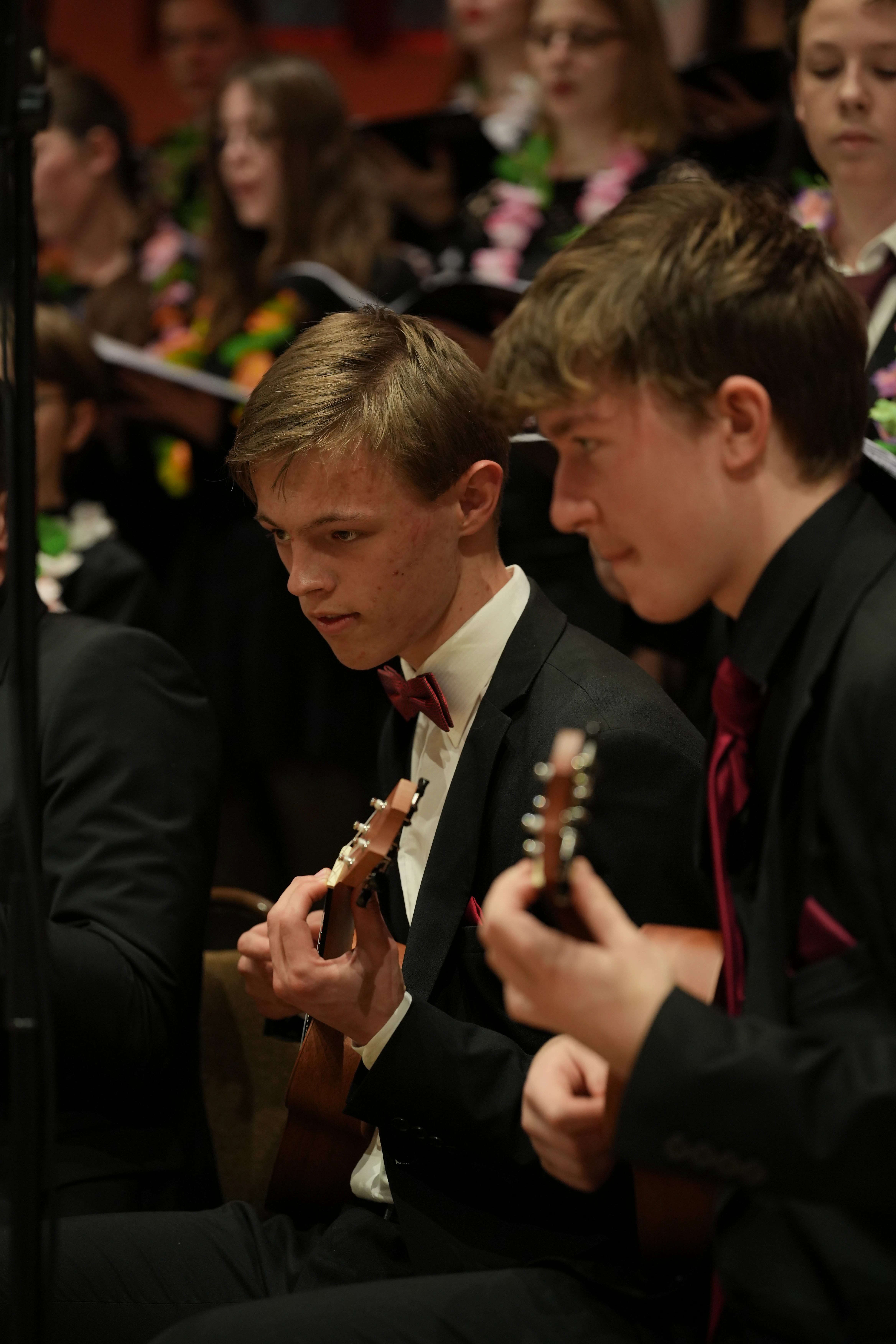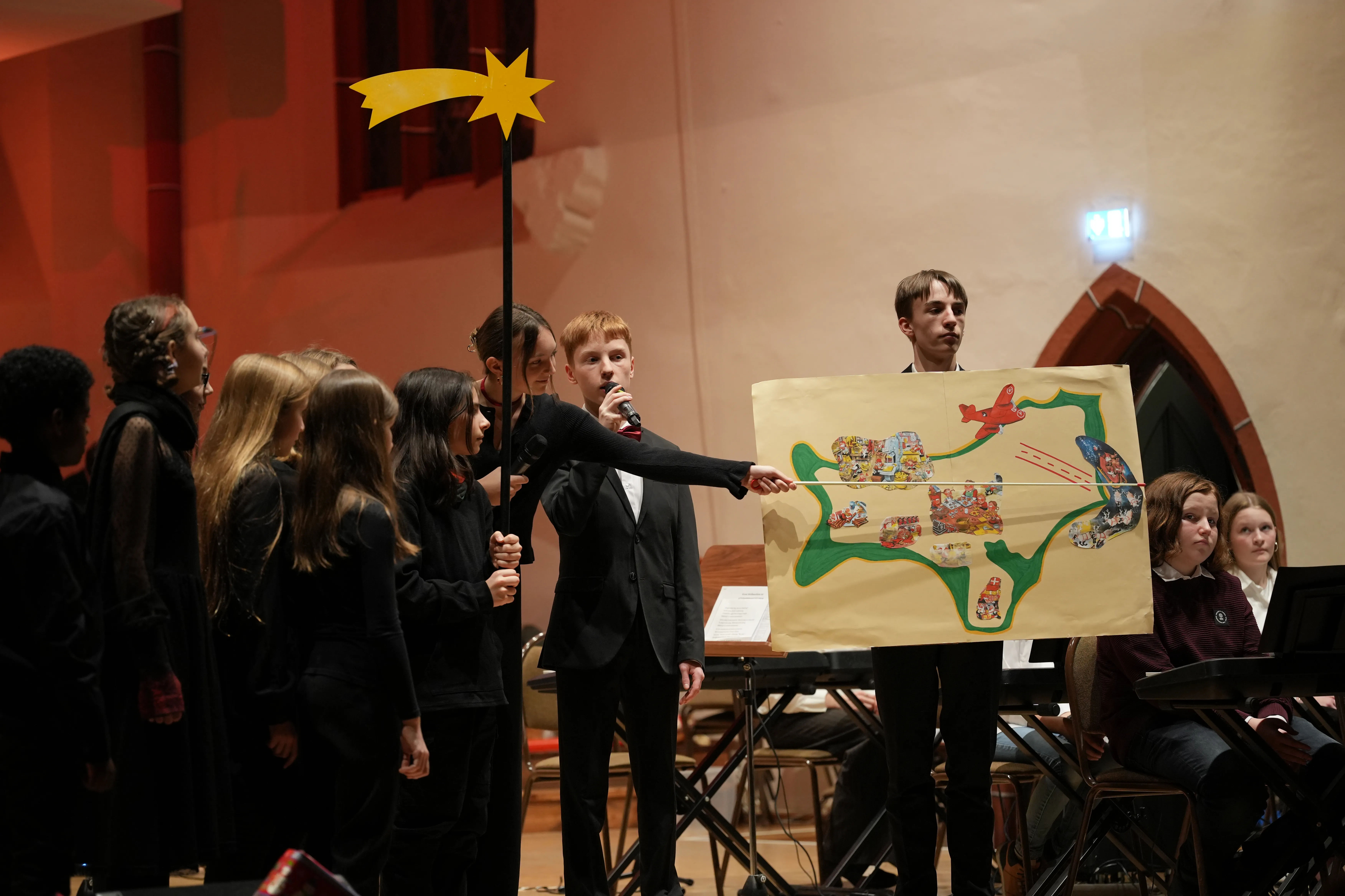 Emmy, Paul und Emil aus der 10. Klasse führten mit viel Charme und Witz als Moderatoren durch den Abend. In diesem Jahr war es eine Reise durch die Welt mit dem Ziel Weihnachtsinsel und unsere Reiseleiter waren stets um eine Wohlfühlatmosphäre bedacht, egal ob am kalten Nordpol oder im warmen Hawaii.